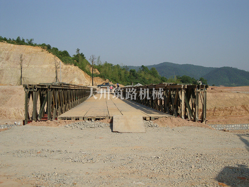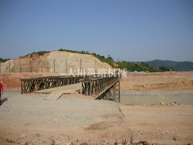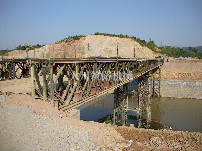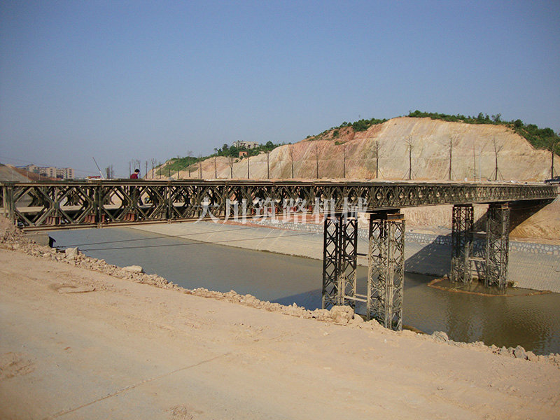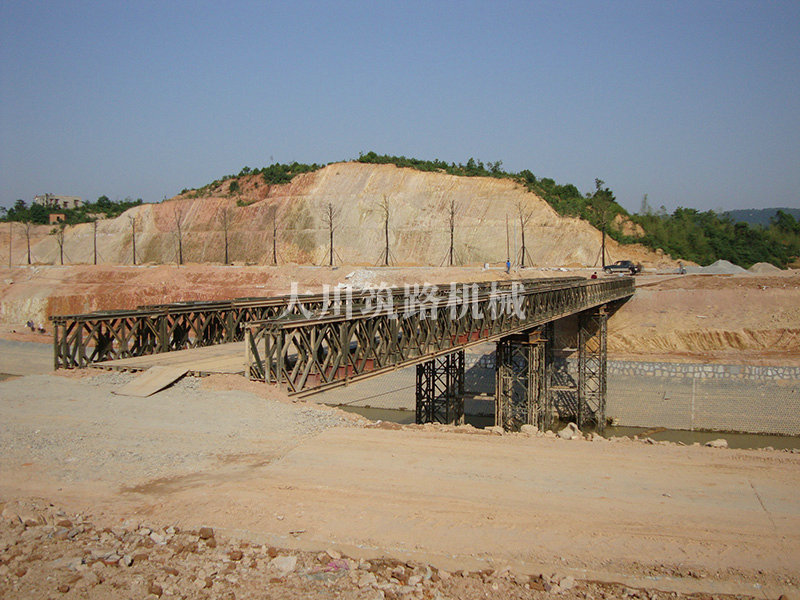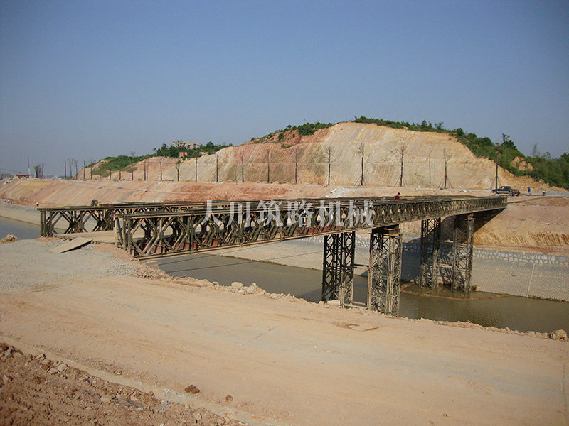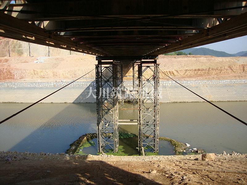 特點(diǎn):本鋼橋由國防科技大學(xué)全程指導(dǎo)和監(jiān)督安裝,滿足荷載80T施工車輛通行,因施工場地要求,采用貝雷梁組合式橋墩,安裝拆除方便,穩(wěn)定性好。采用推出法安裝,安裝周期20天,于2011年5月25日通車。