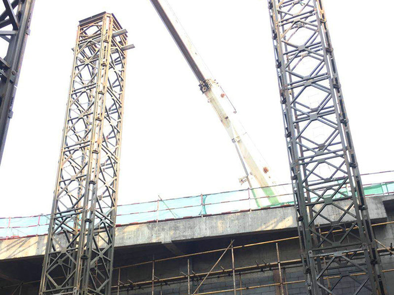 基本情況:部分構件工廠組裝好,分片運輸至現場。采用4片321型貝雷片組合而成的貝雷方柱作為大跨度鋼桁架下部的臨時支撐胎架,待上部鋼桁架安裝完成后分級卸載,最后分片拆除。拆卸后鋼桁架撓度符合要求。貝雷方柱支撐胎架高度達20m,支撐荷載約50t。