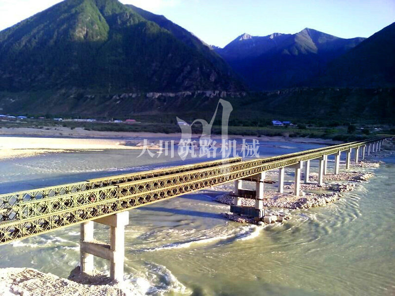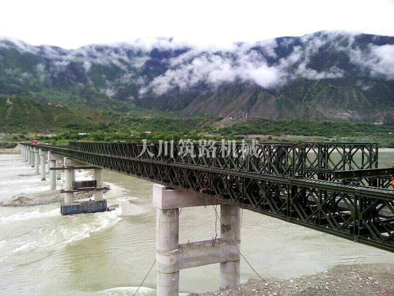 特點:本鋼橋拉薩到林芝鐵路控制性工程的重要組成部分,滿足荷載80T施工車輛通行。主河道水流急,橋墩高,經多方多次論證和設計,最后采用了24+24+24+42+42+24M三排雙層單層混合型加強型雙橫梁下承式鋼橋。克服了施工難度大、氧氣較稀薄等因難因素,采用推出法安裝,于2015年6月通車。